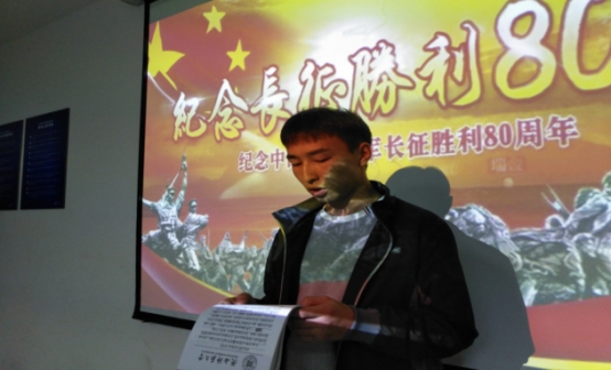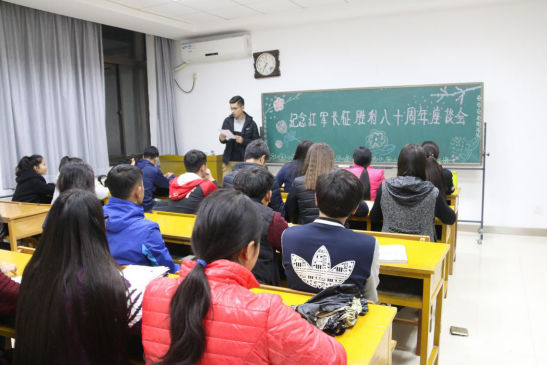 10月27日晚7:00,公司两年制预科七班同学在六附楼201教室举办纪念红军长征胜利八十周年的座谈会。座谈会上,主持人吐力发尔向同学们介绍了本次活动的目的及意义,并提出了一些关于长征的历史问题,同学们都积极回答,各抒己见,课堂气氛十分活跃。最后辅导员总结说:“我们应该将长征精神内化成我们自己的一种力量,它来源于我们内心深处,在我们孤独时,让这种力量带领我们,指引我们,走向胜利,走向前方!”