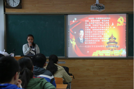 10月21日,在兼职辅导员蒙桂芳的带领下,公司预科一班同学在教学九楼9705教室举办了以“蓝图已绘就,奋进正当时”为主题的班会,本次班会中,同学们观看了有关长征精神的影片,感受长征精神,体会长征文化,探讨有关长征的问题,全方位,多层次地了解长征内涵。通过影片,同学们“重走了”长征路,渡铁索桥,走雪山,过草地,直至最后胜利会师,同学们身临其境,时而揪心难过,时而热血沸腾,毛主席的词句萦绕在同学们脑海:“雄关漫道真如铁,而今迈步从头越。从头越,苍山如海,残阳如血。”在这里,班会的气氛达到了最高潮。几位同学谈了谈自己所理解的长征精神,有同学说:“我们要为崇高理想信念矢志奋斗,同时加强自信,将长征精神渗透到我们生活的每一个角落,并转化为动力,激励我们更好的学习与生活。”同学发言后,现场掌声雷动,经久不息。