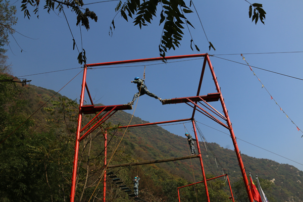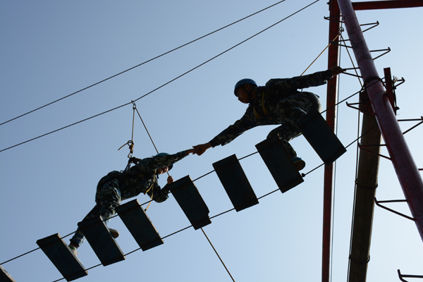 本次素质拓展在多位教练的带领下,以小组为单位开展活动,共进行了“高空断桥、独木桥、缅甸桥”、“木屐行走”、“我们是最棒的”、“人墙翻越”四个意义非凡的项目。高空行走是本次训练中最具挑战性的项目,每位同学需在绑好绳索的前提下依次完成位于距地面八米的断桥、独木桥、缅甸桥的行走任务,许多同学因恐高而停步不前甚至想到退缩,但都能在教练的鼓励和同学们的加油助威中出色完成任务。这项训练能够让同学们战胜自我,克服心理恐惧,增强自信心,提高控制与决断能力,感受换位思考的重要性。在“木屐行走”活动中,同学们用心感受非语言沟通的默契,大家步调一致,团队协作,提高了团队行为的协作性,增强和培养了队员们的领导力。“我们是最棒的”是本次训练中相对轻松却又充满趣味的训练,本项训练考察队员们的反应能力,队员们密切配合,动作机敏,活动的趣味性让在场的每一位同学无不喜笑颜开。最后的结业项目是“人墙翻越”,教练给大家的目标是在28分钟内所有队员体验“绝壁求生”,在只有一根橡皮筋的情况下,所有队员通过组建人梯的方式依次翻越高墙,队员们踩在由几位男同学搭建的血肉人梯上努力攀爬,先翻越高墙的队员们再利用橡皮筋将下面的同学拉了上来,队员们将力量拧成一股绳,只用了15分钟就出色完成了任务。这项训练中,每位同学都具备个人奉献与牺牲精神,合理利用团队中的角色,科学的解决问题,培养了队员们的领导力和决策力,磨练了团队的凝聚力和战斗力。