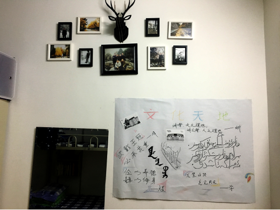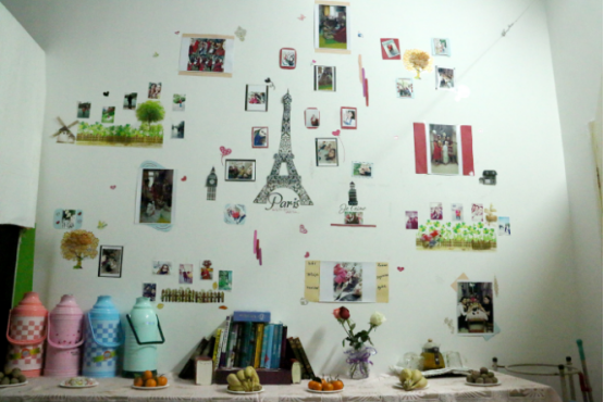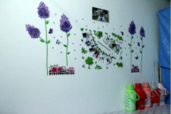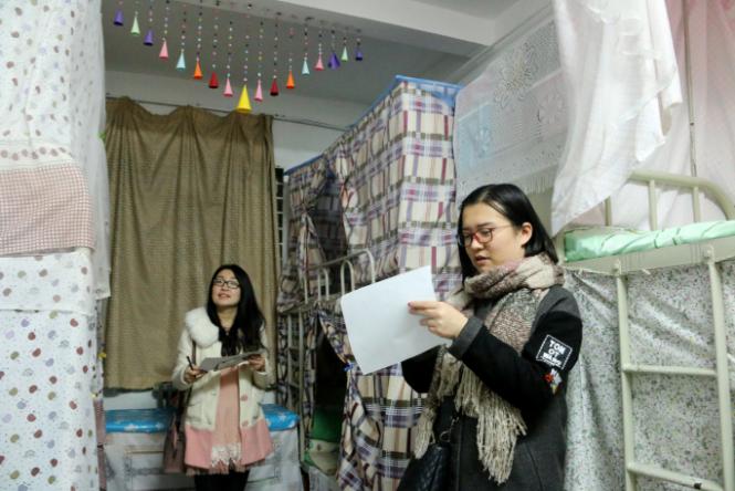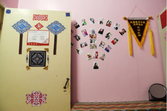 评审组首先来到12号男生员工宿舍楼进行观摩,接受观摩的部分宿舍代表向大家介绍了其寝室的布置方法及亮点,个别男生宿舍将寝室将墙壁一角制作成愿望墙、文化天地栏等,有的还贴了各式的壁纸,铺上了各样的地毯,使寝室成为“星球世界”、“运动天地”等,整洁干净、通风良好、富有创新的男生宿舍使各位评审老师刮目相看。接着评审组来到2-3号女生宿舍楼进行观摩,女生宿舍与男生宿舍文化差异甚大,一些手工艺妆品、本土文化特色充满温馨的寝室,废弃饮料瓶纸做的书架、小纸帽做成的吊链,宿舍门上的贴花和装饰都充满民族情怀。从这些宿舍装饰中,流露出同宿舍不同民族成员之间浓厚的感情和同窗友谊。