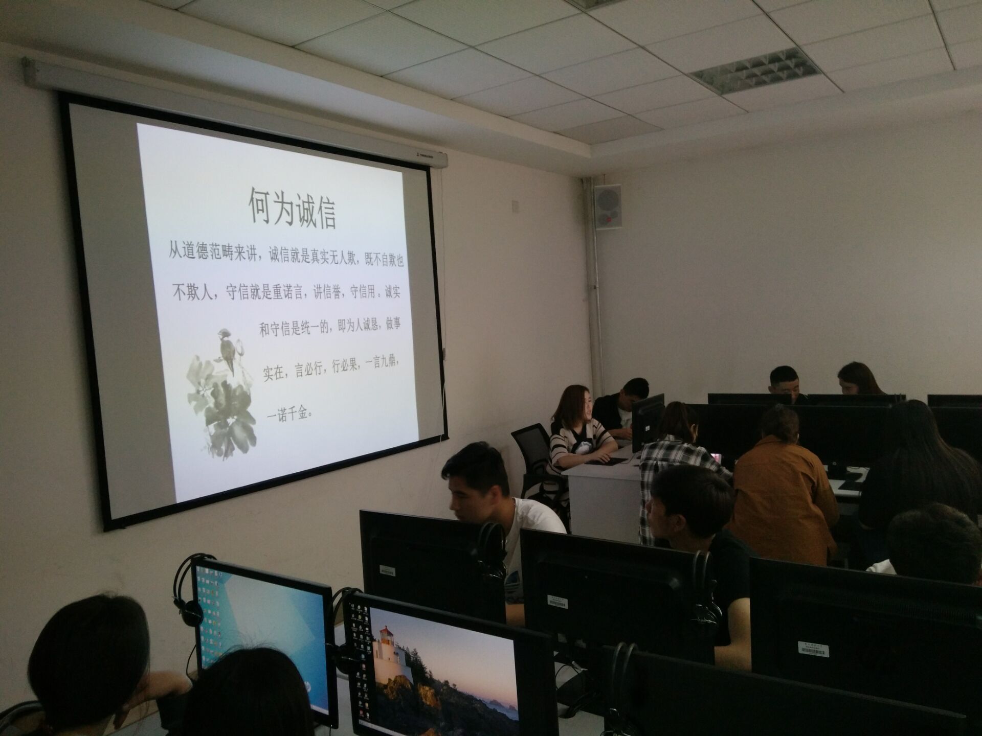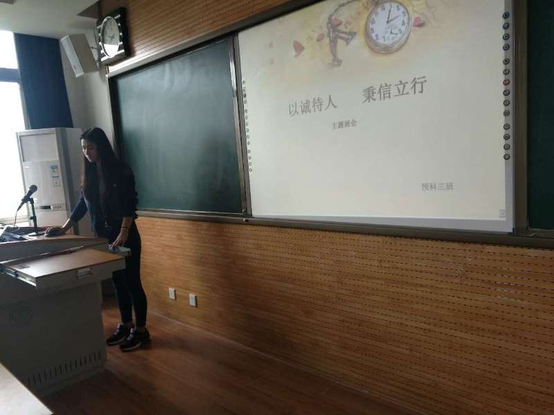 “至诚则成,立信于行”主题班会上,预科三班的同学们通过多媒体播放幻灯片,观看了诚实守信的小故事。在播放了大家自编、自排的话剧后,同学们展开了激烈的讨论,通过自由互动环节,同学们自告奋勇,分享自己在生活所经历或亲眼所见一些关于诚信的事件,以及观看话剧后的心得体会。预科六班的同学通过分组制作幻灯片,演示并讲解了诚信与校园生活的联系。通过班会,使同学们都充分的认识到了诚信的重要性,铭记在以后的学习和工作中以诚信的优良传统美德指导自己的一言一行。