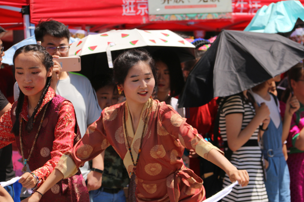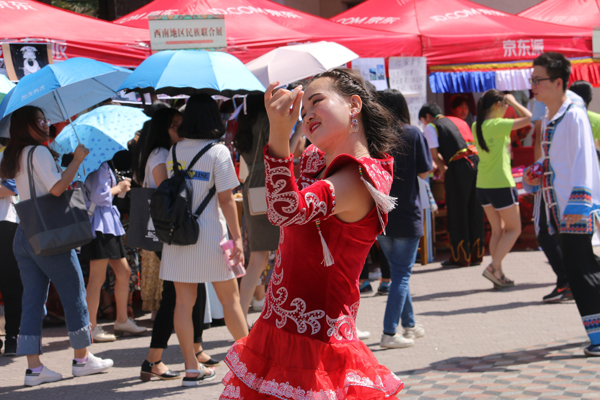 开幕式上,各位领导嘉宾与少数民同学优秀代表互赠礼物。老师用《青年们,读马克思吧!》等书籍勉励同学们努力学习,用实际行动回报伟大的祖国;同学们用一条哈达、一顶花帽表达对老师教育之恩的感激。之后,全体师生一起欣赏了民族大联欢舞蹈《母亲是中华》,并参观了各民族员工展示的极具特色的民族工艺品、服饰、乐器、特色小吃,各位领导嘉宾不时驻足,饶有兴趣的拍照留念。