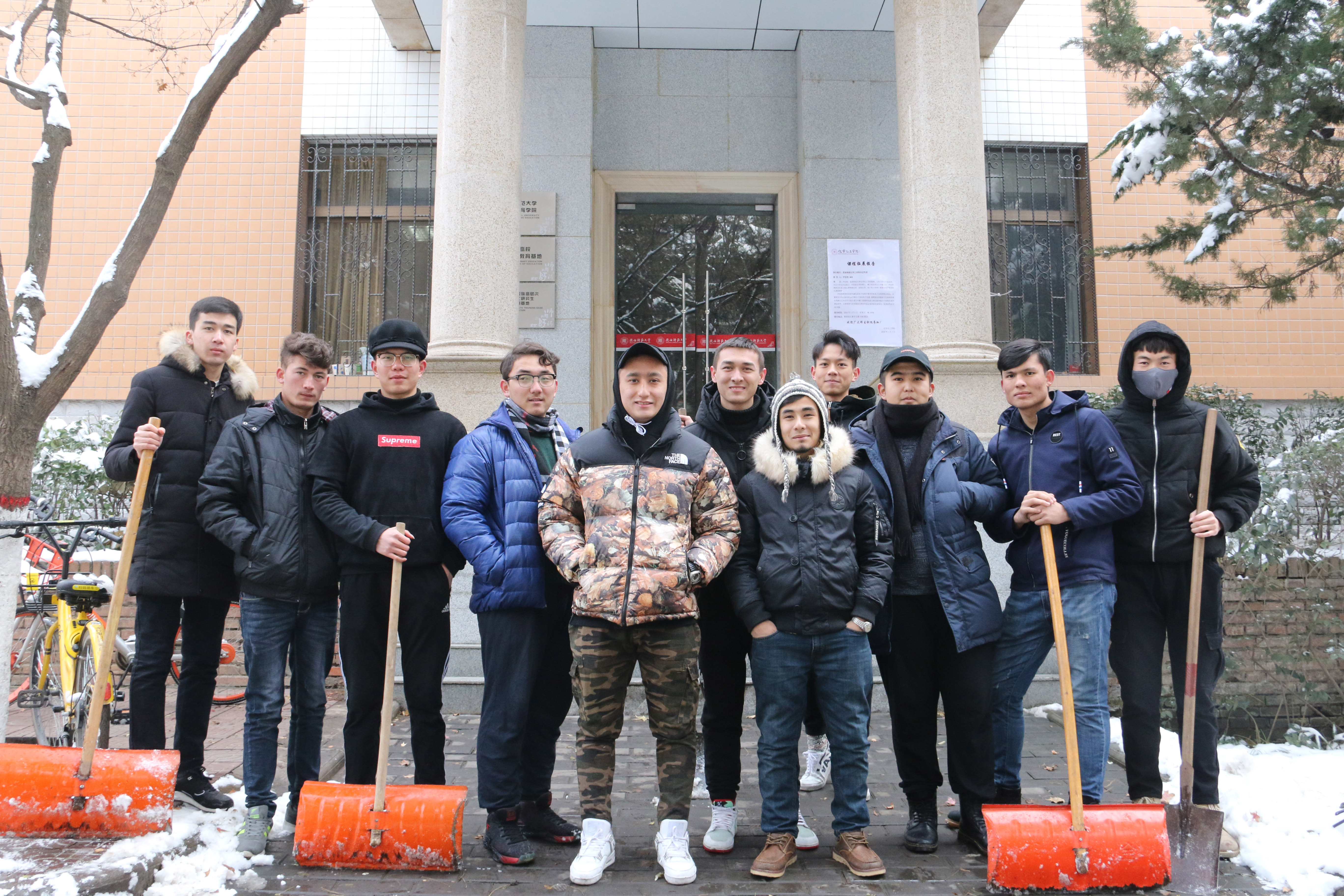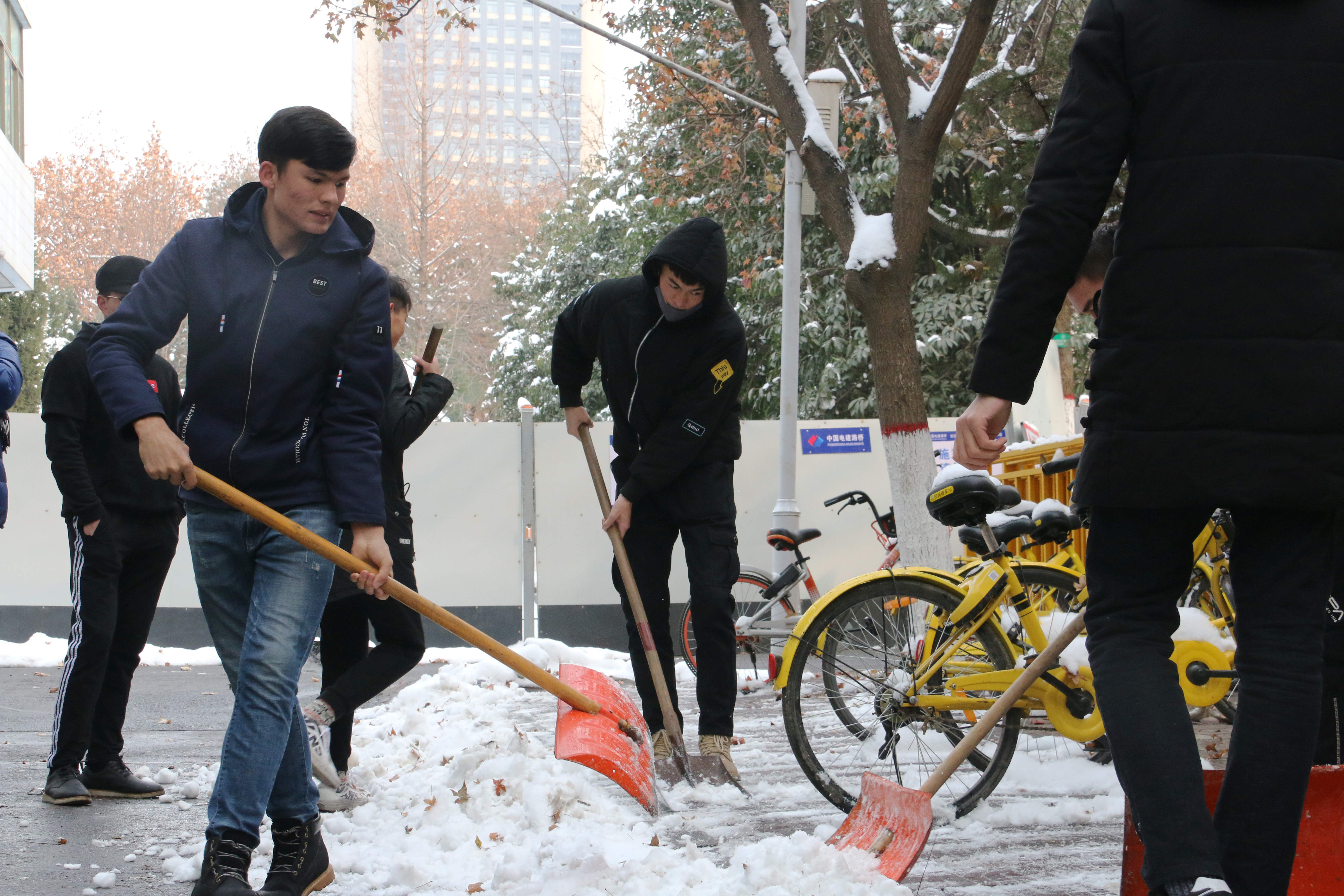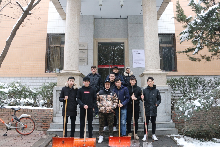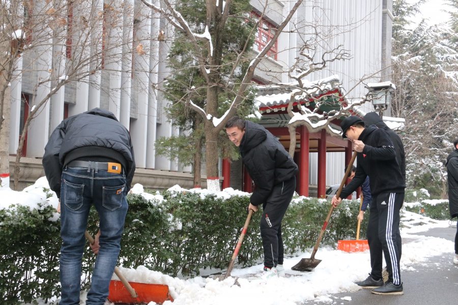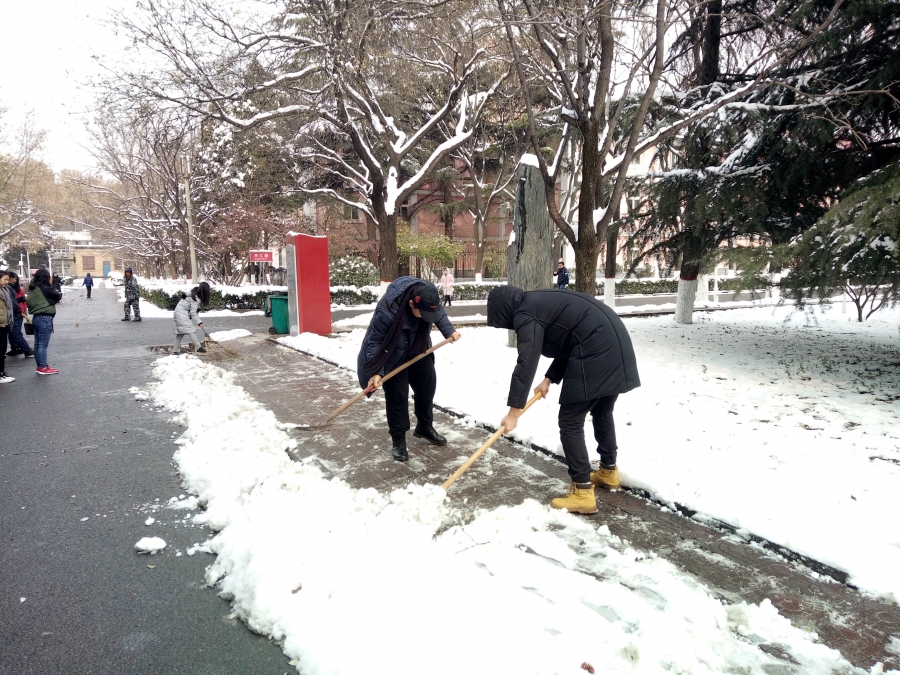 公司从后勤服务处物业科借来了扫雪用的铁锹、扫帚等工具,同学们不畏严寒,积极参与,相互配合,有的同学负责扫雪,有的同学负责铲冰,大家干得热火朝天,忙碌的身影构成了一道亮丽的风景线。虽然室外温度很低,但大家劳动的热情和团结协作的场面让这个冬日变得格外温暖。经过一个小时的奋战,六附楼周围和主干道的积雪全部铲除,原本满是冰雪的道路变得干净整洁,路面状况、通行能力得到明显改善,为广大师生提供了便利。