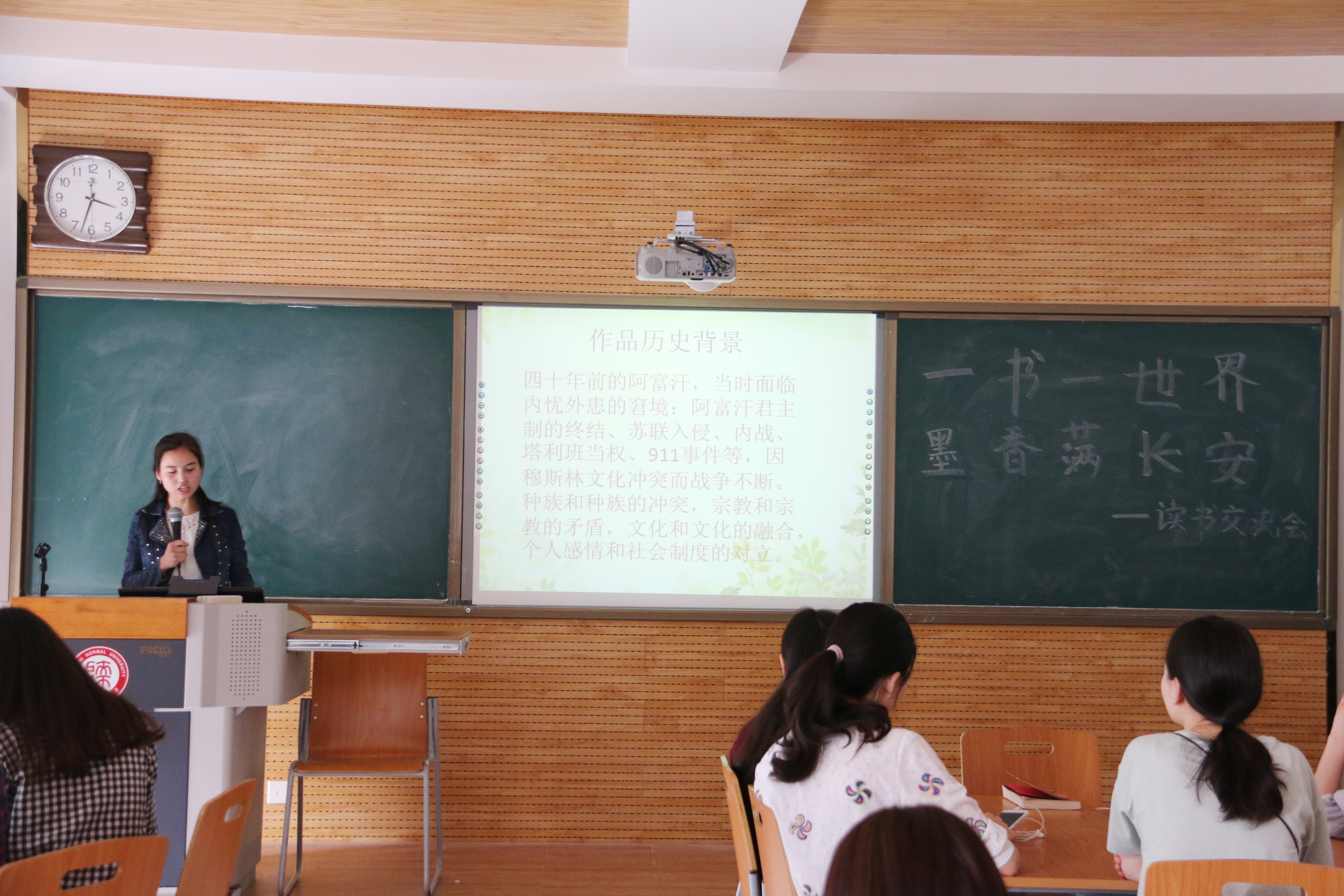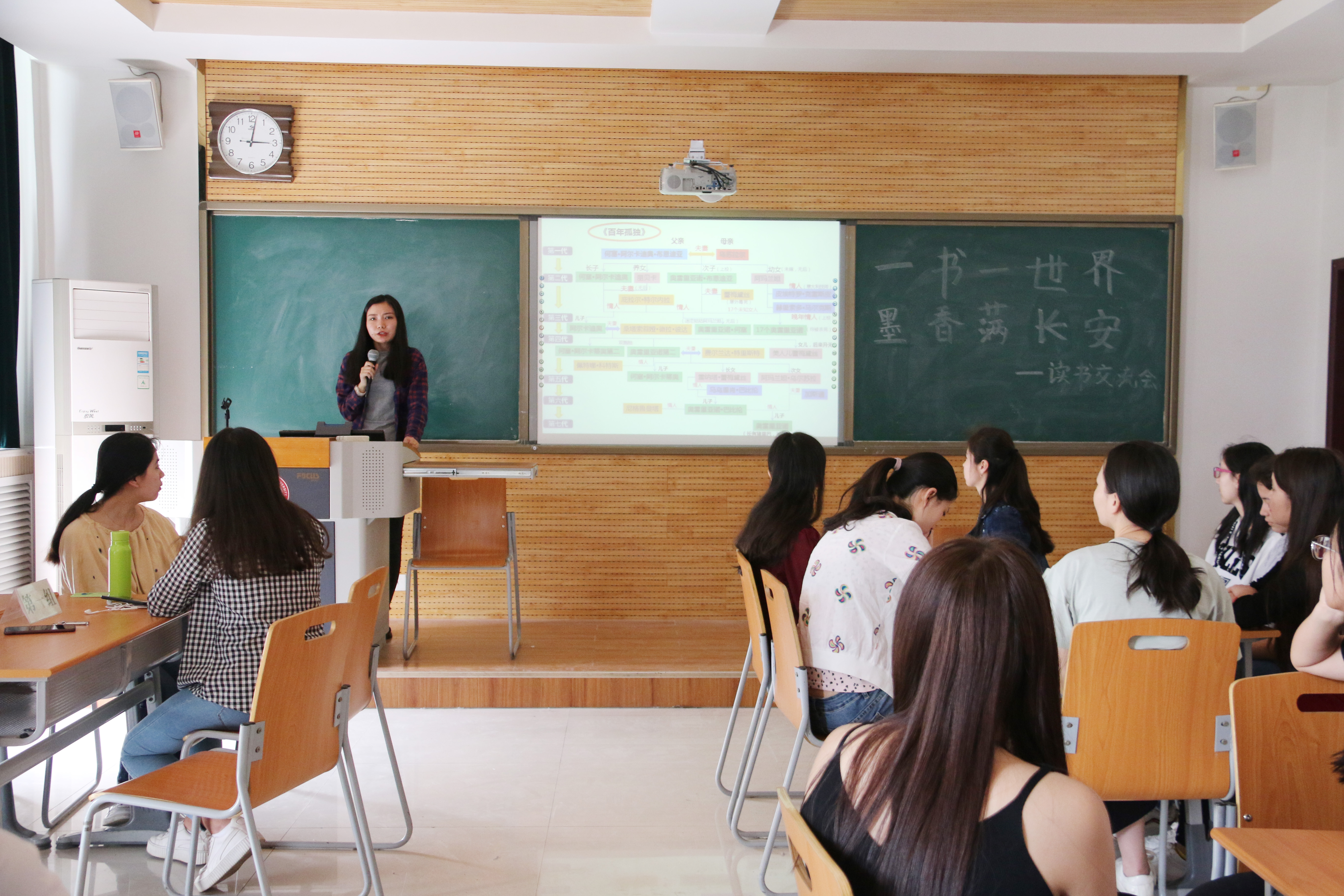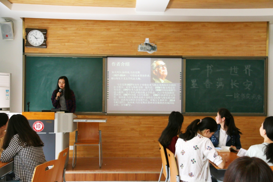 参加本期活动的同学们分成四个小组,每个组选读一本书,然后将读后感制作成PPT的形式跟大家分享。这次选的书有《百年孤独》《巴黎圣母院》、《追风筝的人》,虽然第一组和第四组不约而同地选了《百年孤独》,但讲述风格各有千秋。一部繁杂庞大的百年家族史,一部脉络清晰的地方兴衰史成功引起了同学们的注意。第一组主要是围绕着书的内容来介绍,让听者深陷作者为我们塑造的感情世界之中。第四组是以书的文学风格进行讲解,使同学们了解到它的文学背景。第二组讲的是《巴黎圣母院》,一栋古老的钟楼,一段旷世奇缘的爱恋。有美丽、有丑陋、有善良、有邪恶……走进文学瑰宝《巴黎圣母院》中,他们以先整体再具体的方式来讲解,使同学们对《巴黎圣母院》有了更深刻的了解。第三组讲的是很有影响力的小说《追风筝的人》,这是一个关于背叛与救赎的故事,第二组同学对这本书的介绍详细生动,吸引了在场观众的目光。