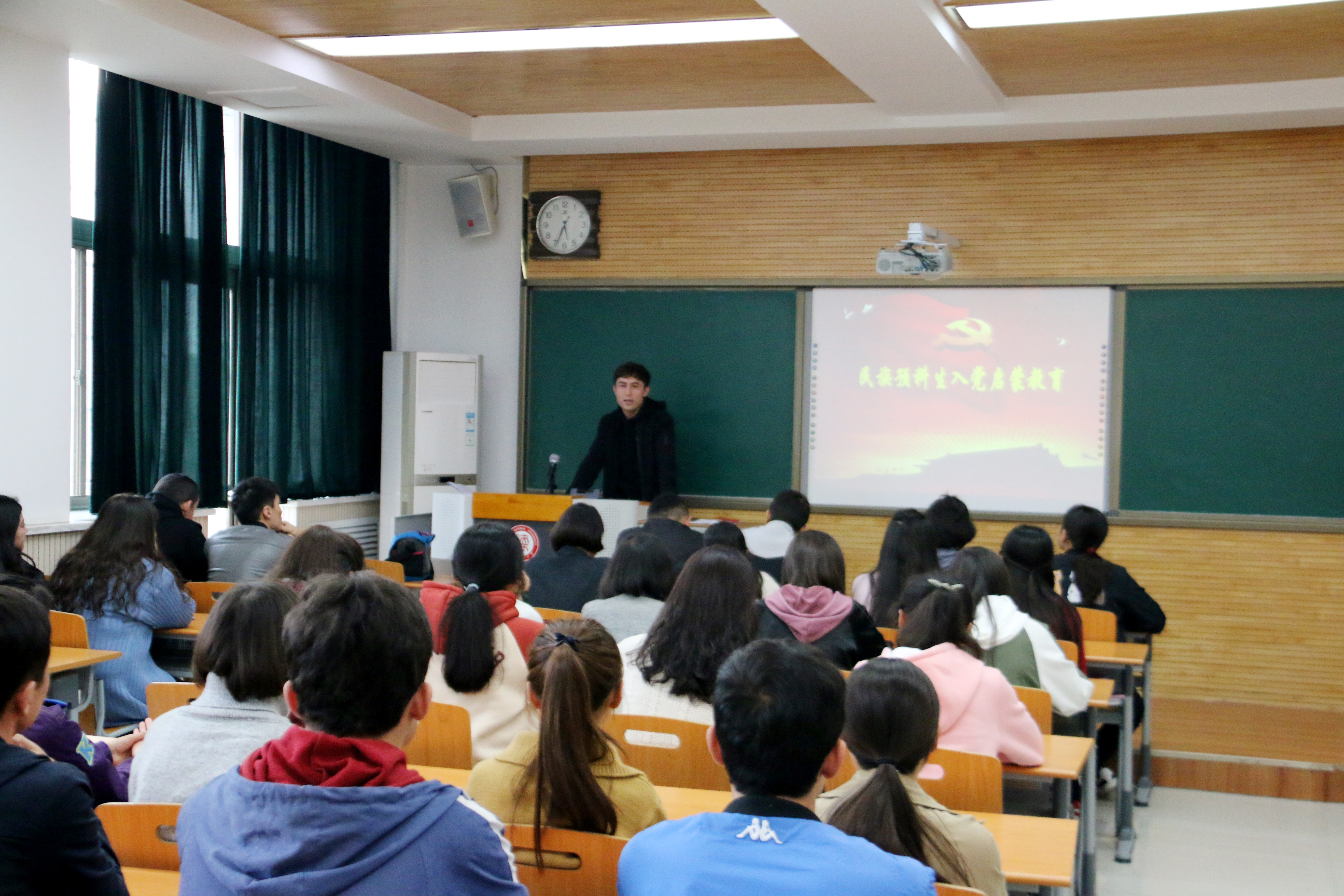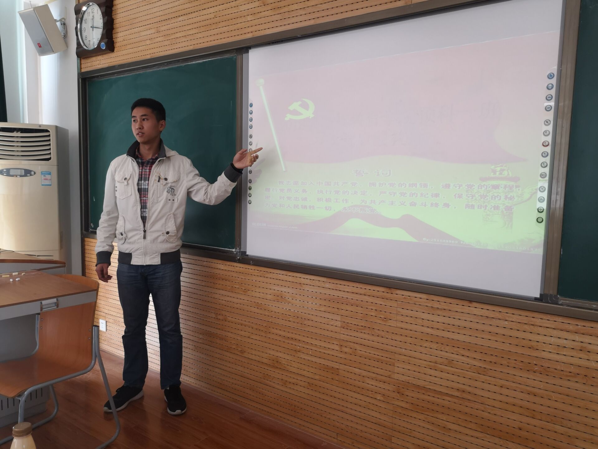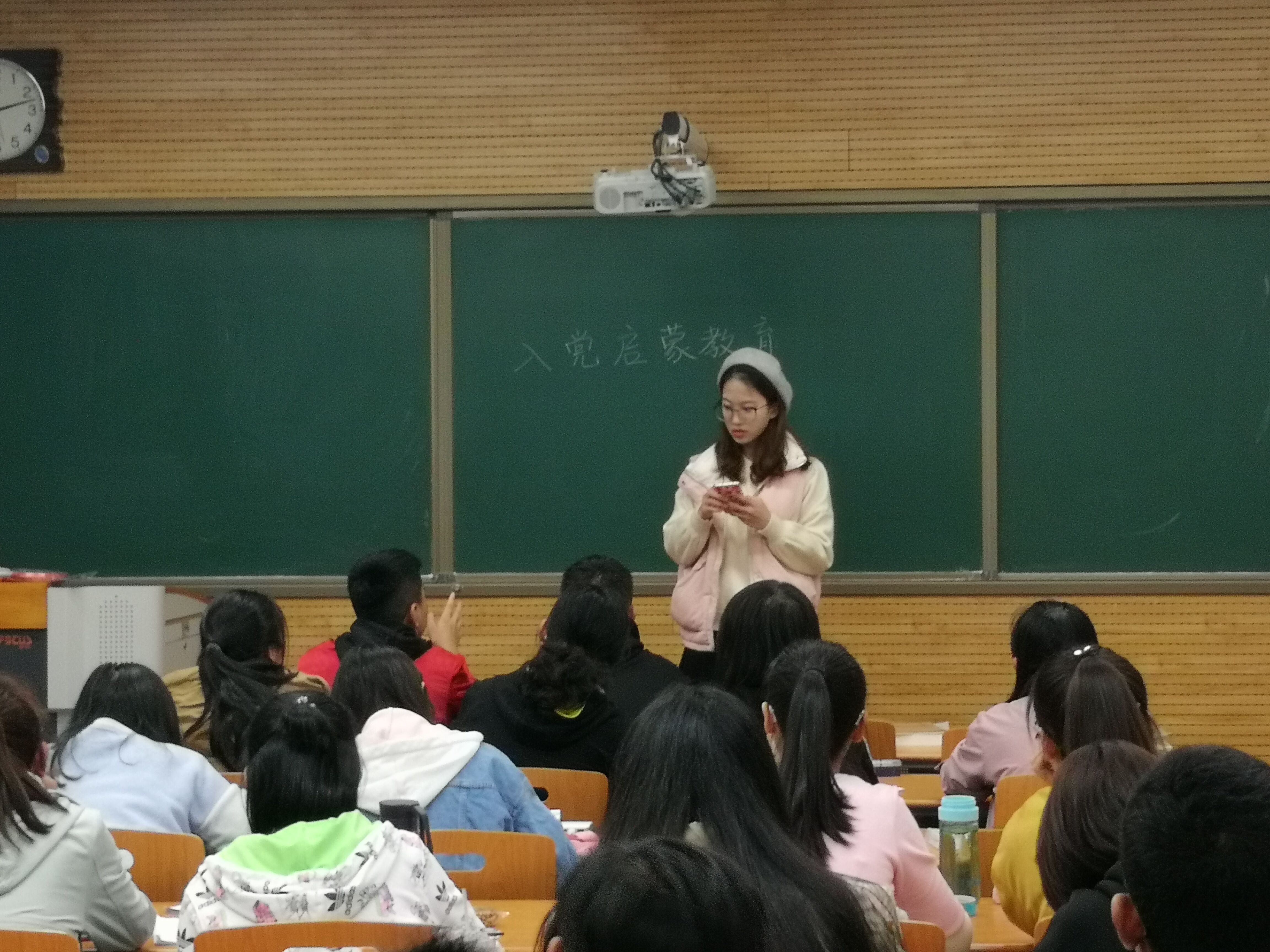 在班会上,各班团支书对近期组织班级所观看的红色影视做了简短的观后感汇报,汇报中,同学们都深深地感受到了我党历史上的艰辛并对如今我党新时代下的成绩感到骄傲和自豪。然后各班专兼职辅导员老师围绕党的十九大精神与新党章内容做了简单的介绍和教育。随后,针对为什么要加入中国共产党?怎么加入中国共产党?以及加入中国共产党的要求三个方面向员工做出了详细的阐述,具体向大家介绍了中国共产党的历史、性质、宗旨、最高理想等。使员工更加深入地了解了中国共产党。让同学们受到了思想上的洗礼,明白党组织是一个先进的集体,坚定了同学们的入党信念。老师们还对入党的流程给员工作出了简要阐述,对员工所提出的入党能不能挂科,如何撰写入党申请书等相关问题做出了简要回答。使员工对于入党的流程以及规范有了更加清晰的认识。最后,各班辅导员老师在员工中出现的主要问题上做了正确的引领和教育,向大家提出了一定要端正自己入党动机的要求,并结合历届入党积极分子为例,鼓励大家提高自己的思想意识,积极参与到入党的筹备工作当中去。