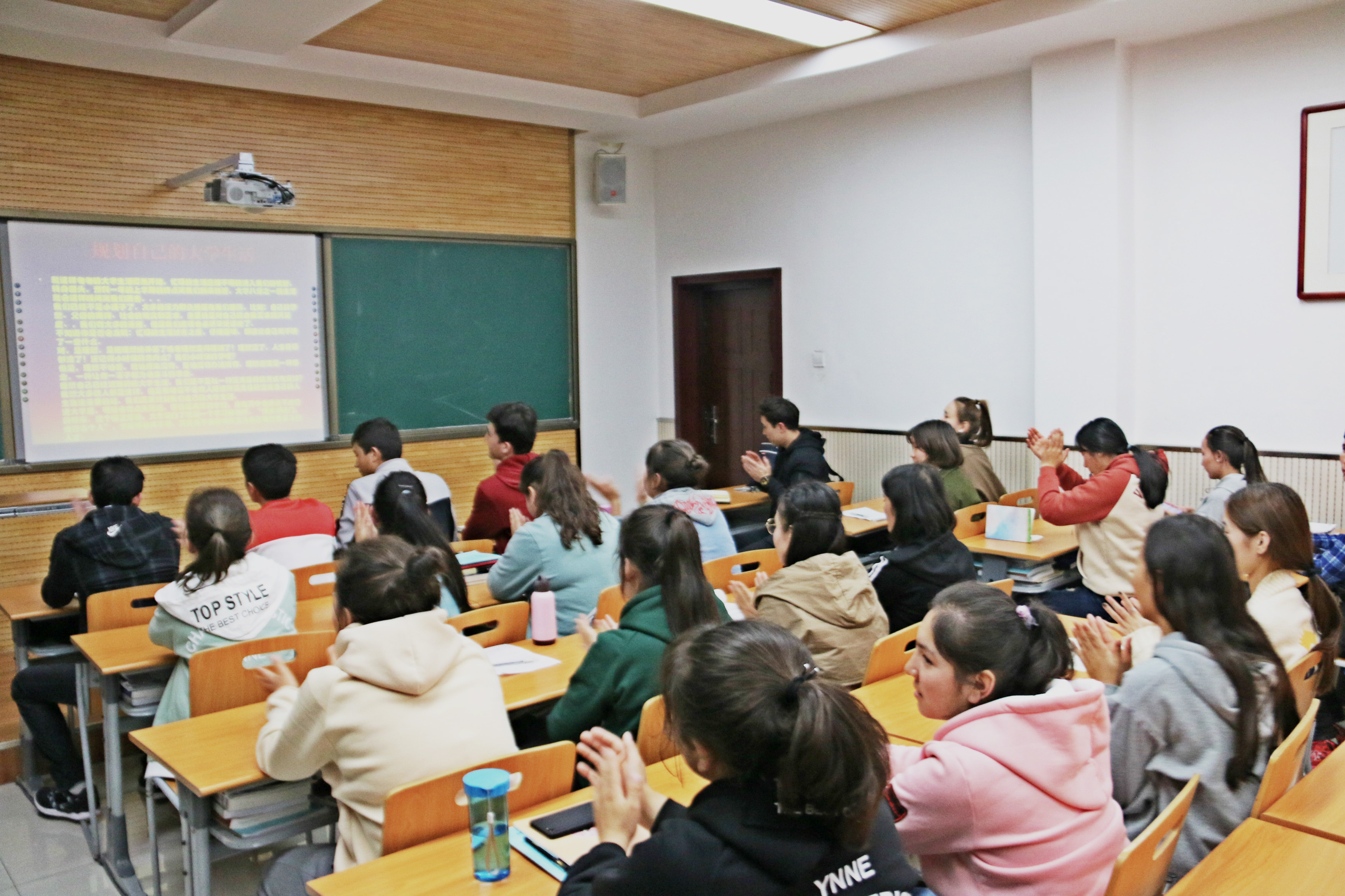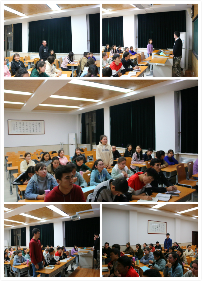 班会最后,辅导员热依木老师做了总结。首先,他从学习、生活环境、人际关系及心理健康等四个方面的适应性教育做了简单综述,并针对同学们在班会上所提到的困惑和问题进行了分析,分享和提出了个人当时如何适应老员工活的经验和几个建议;他强调,只有好的开始、好的习惯的养成,才能为取得成功创造先决条件。最后,热依木老师希望同学们在校期间打好扎实的语言基础,提高计算机应用水平,培养独立思考和创新能力,读好书,以“用心开启智慧,用行实现梦想”为结语,鼓励同学们不断进取,继续攀高。