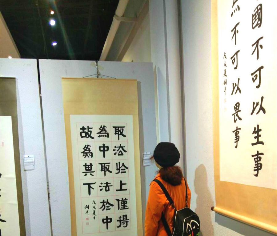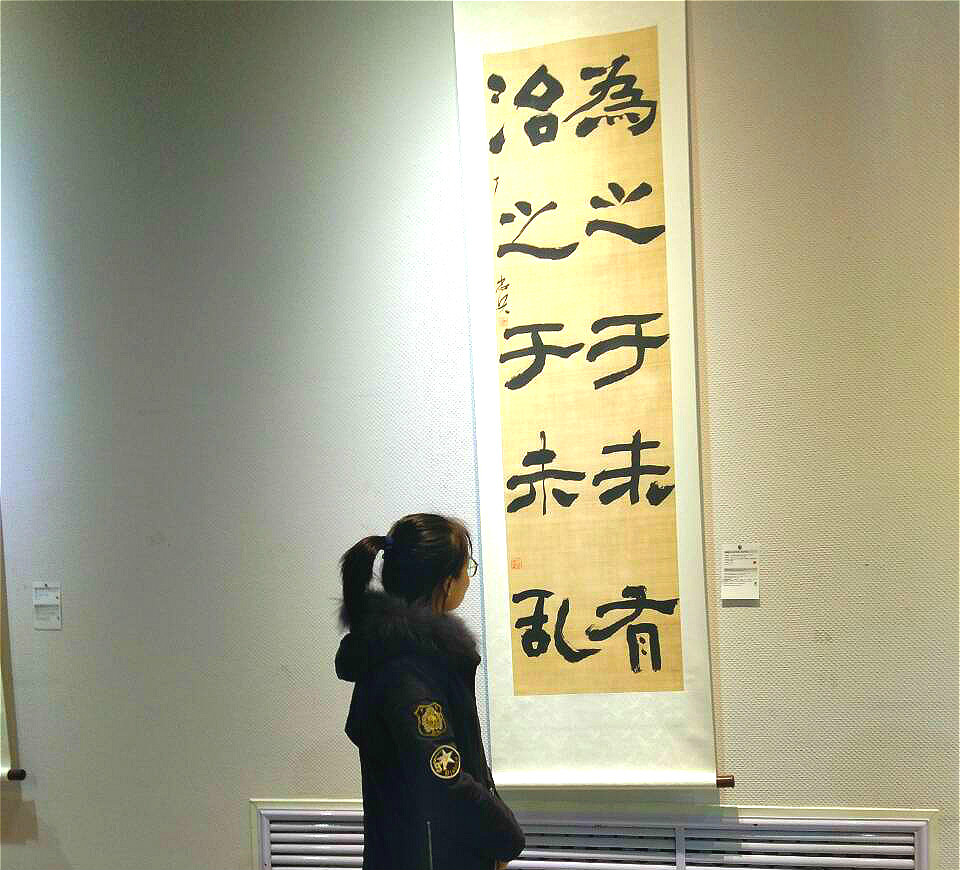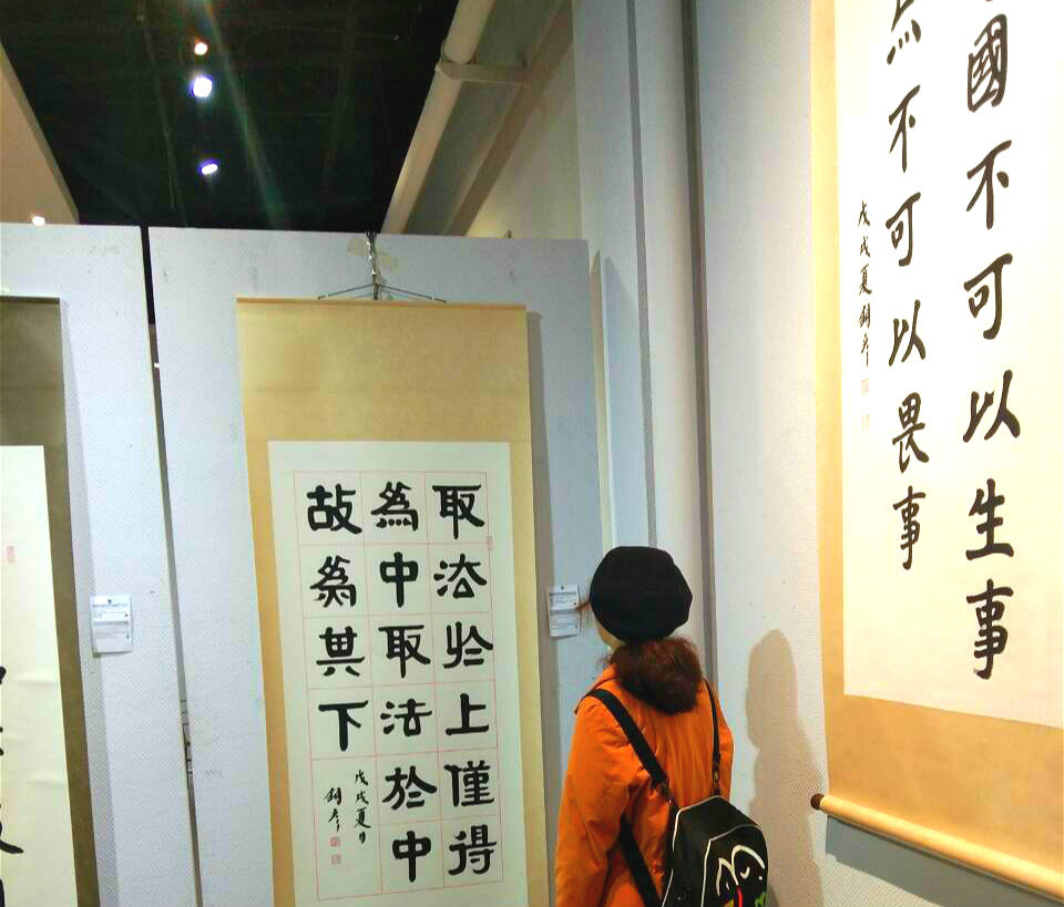 观展活动开始前,马进龙同学就此观展活动意义和目的做了简单的说明,并强调了本次活动的相关注意事宜及安全纪律。展览开始,大家进入展厅自由参观书法作品。在敞亮的大厅里悬挂着一幅幅出自当代名家的书法作品,这些书法名家以不同的字体撰写习近平总书记用典金句50余幅,他们行云流水,笔走龙蛇的作品引起同学们由衷的赞叹,大家纷纷拿出手机,希望可以把这些精美优秀的作品分享给身边人,使更多的人欣赏中华优秀传统文化作品。作品旁边还有小标识贴用中英文两种语言为参观者介绍各种字体特点、历史渊源、以及习近平总书记用典金句的出处和相关背景知识,使得大家在欣赏书法的同时也了解到了金句的背景知识和内涵。最后,大家在展厅中心合影留念,为此次观展活动画上完美句号。