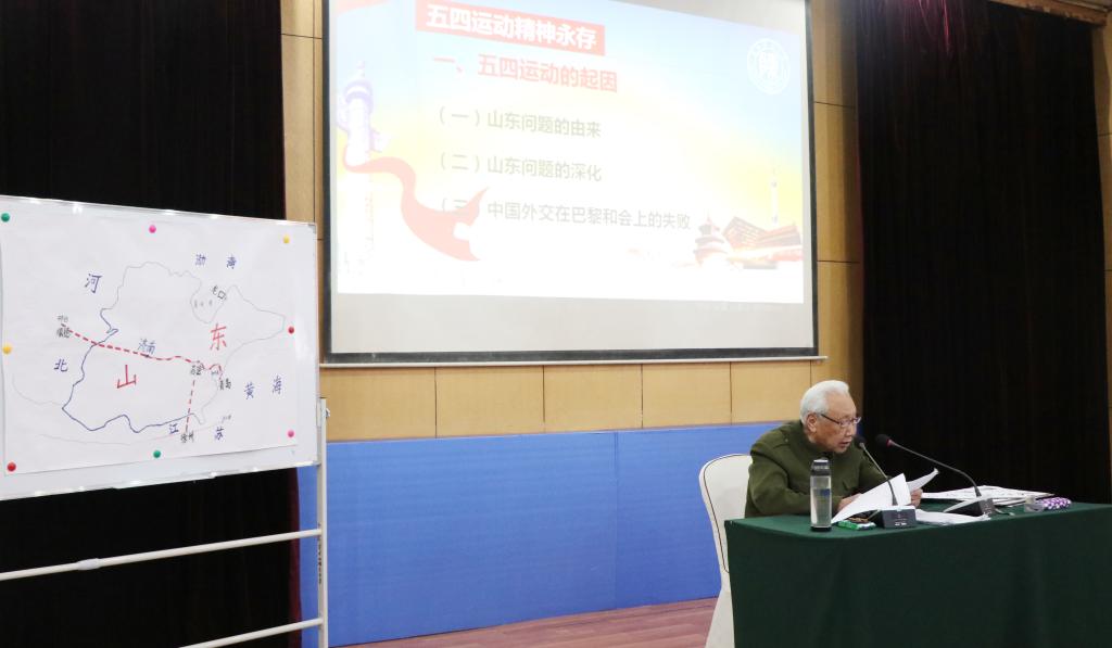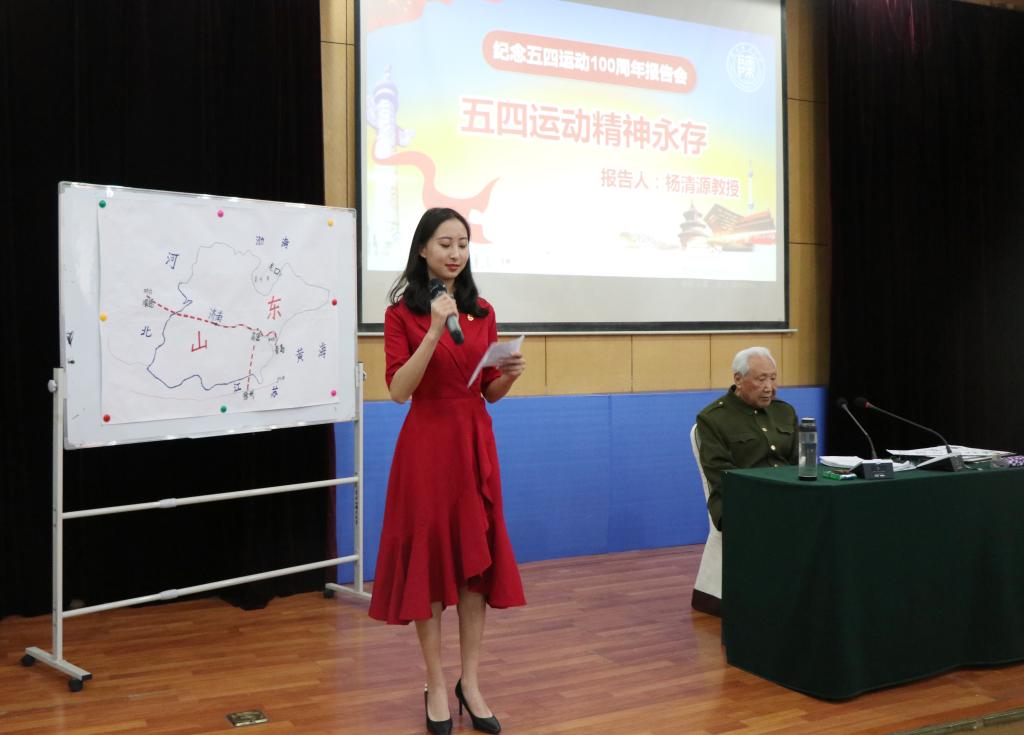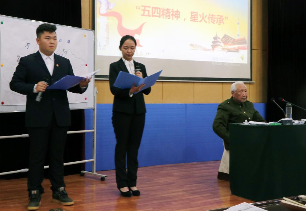 报告会最后,2018级预科二班邹粤龙同学和付歆瑜同学声情并茂地朗诵了诗词“五四精神 薪火传承”,表达了他们对五四精神的理解。朗诵结束,杨教授站起来挺起腰板,颤巍巍的抬起右手向在场师生敬了一个特殊的军礼。杨教授的精彩报告使员工们的归属感、责任感、荣誉感、使命感油然而生,现场掌声不断。