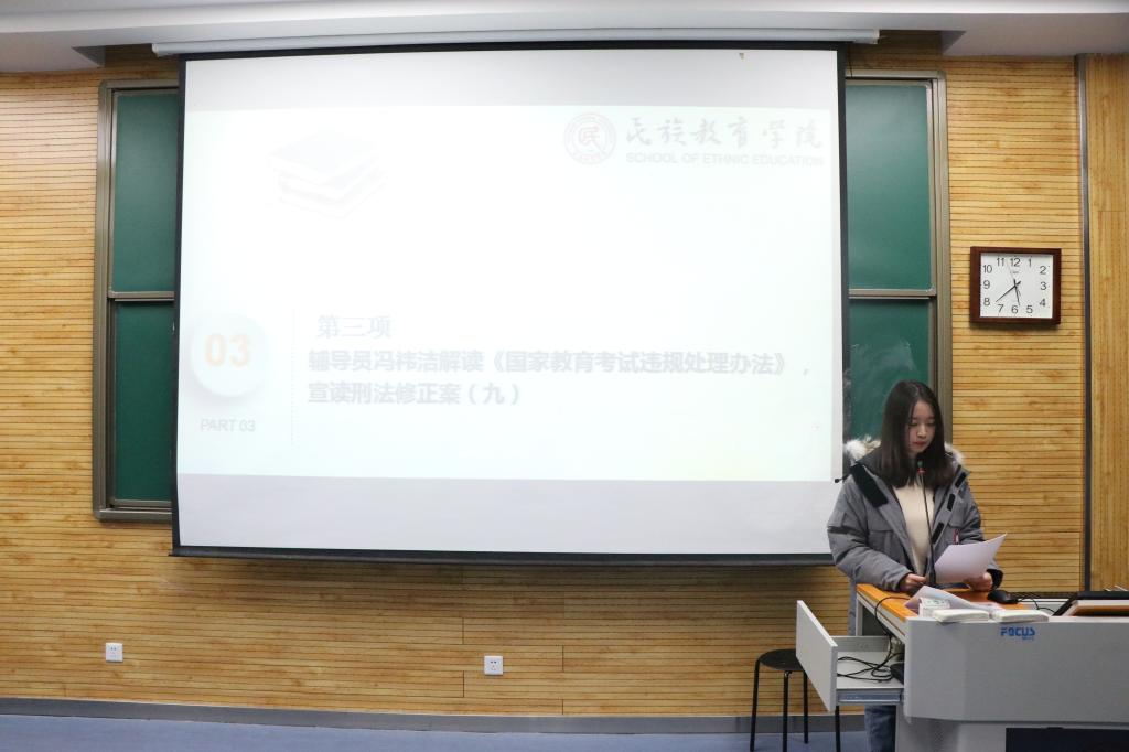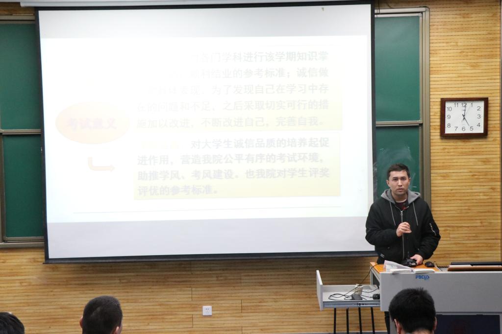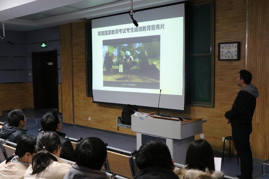 大会伊始,同学们观看了《国家教育考试考生诚信教育宣传片》,引起大家对诚信考试的重视。接着,兼职辅导员许珊带领员工重新学习了《员工手册》中关于“学籍管理实施细则”和“员工考试违纪、作弊处理办法”相关规定,向同学们详细介绍了什么是违纪、什么是作弊以及违纪作弊的相关处理和对个人未来发展的影响。兼职辅导员冯祎洁宣读了《国家教育考试违规处理办法》,倡导同学们遵守纪律,诚信应考。