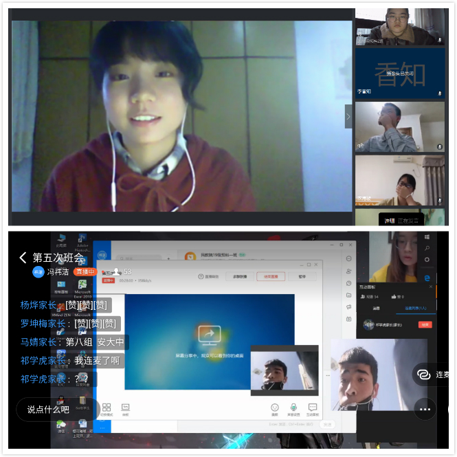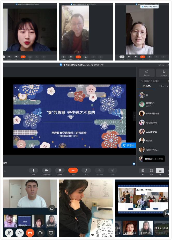 预科三班则以“‘秦’劳勇敢,守住来之不易的‘零’”作为云班会主题。班会上,首先通过视频的形式向同学们展示了抗击疫情过程中涌现出的感人事迹和敢于担当、取得突出成绩的正面典型,同时通过视频向同学们介绍了近期的疫情信息,让同学们对现阶段疫情的发展有了更深入的了解。随后,同学们与唐涛老师、卢静老师和谢欣然老师进行了热烈的师生互动,大家一起畅聊疫情期间生活状态,交流内心的感受和感思,班会最后,辅导员热依木老师做了班会总结。