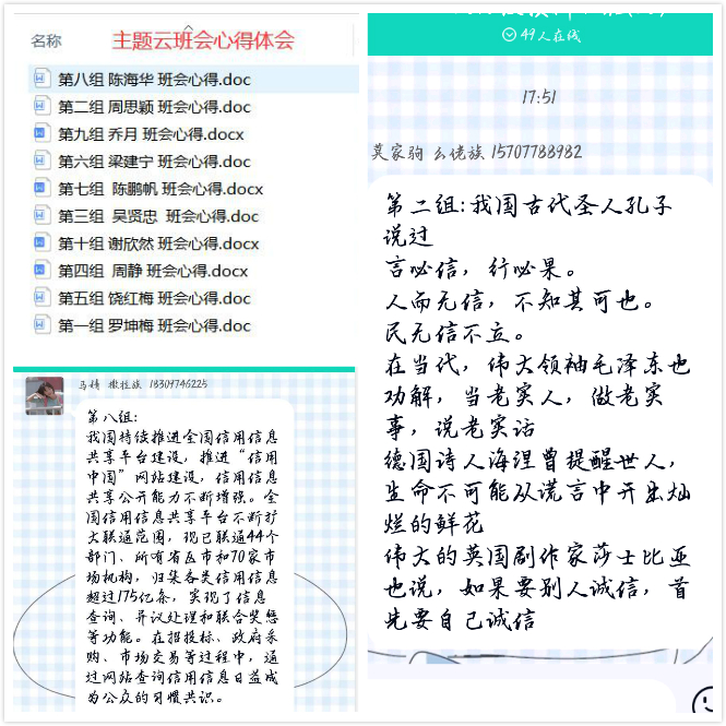 1、主题班会拉开活动序幕。活动伊始,公司各预科班根据2020年员工工作要点,积极围绕本届活动月主题召开线上班会,将诚信教育活动与校风传承、学风建设、文明校园建设相结合,让“秉信立行”观念融入班级建设、课堂学习、学术研究和宿舍生活,影响带动更多员工以诚修德。