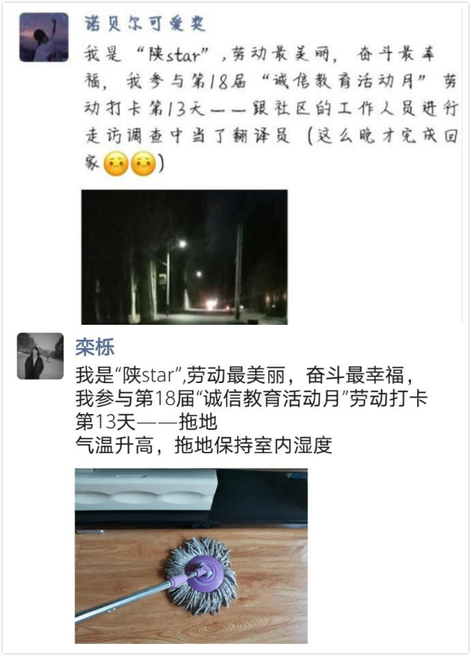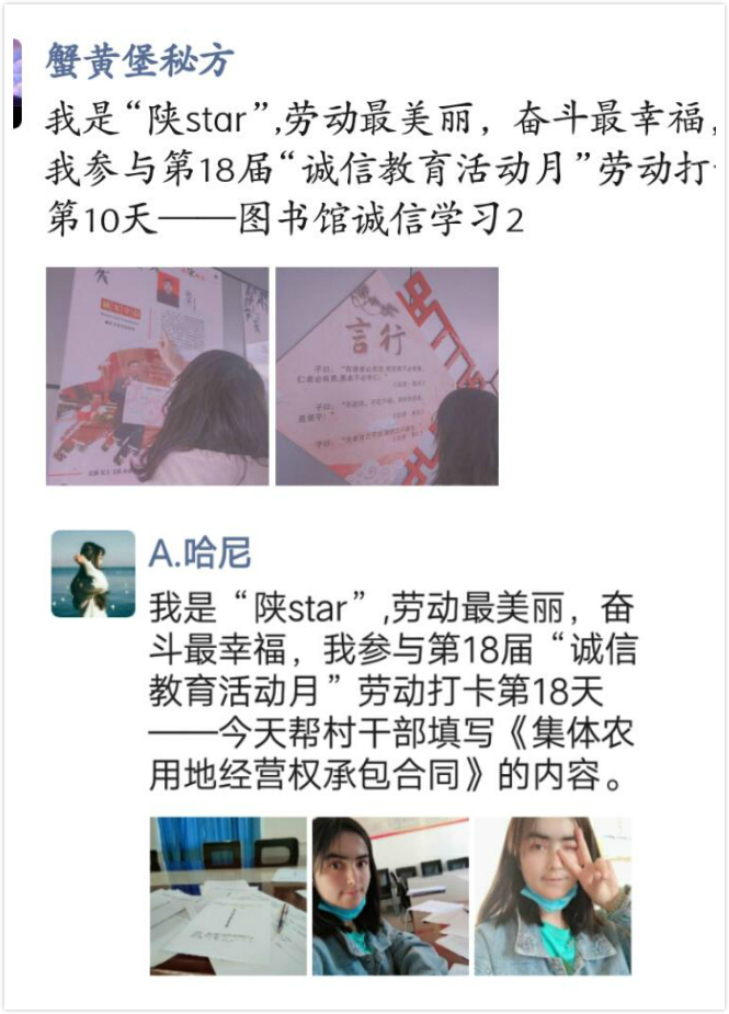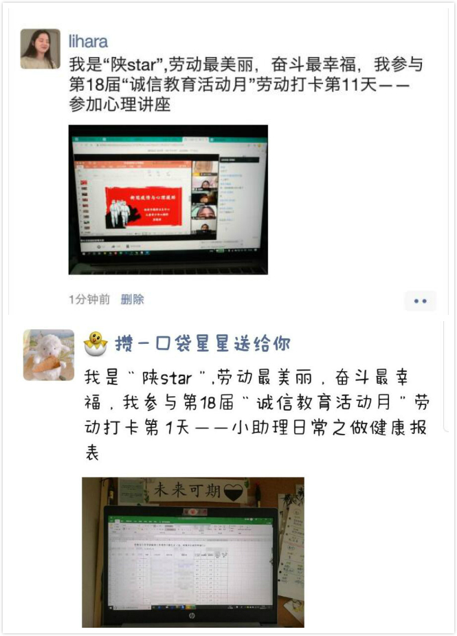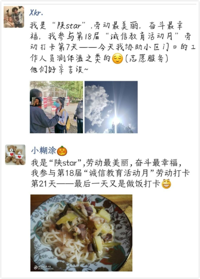 5、线上打开夯实教育效果。为加强疫情期间员工居家劳动教育,将诚信教育与劳动教育有效结合,公司丰富主题教育活动形式,开展“21天”诚信劳动打卡活动。鼓励员工将连续21天参与劳动的画面进行线上平台展示,分享劳动心得体会,较好地提升了员工门热爱劳动、诚实守信的思想意识。公司76名员工积极参加此项活动,分享了自己劳动收货和感悟。