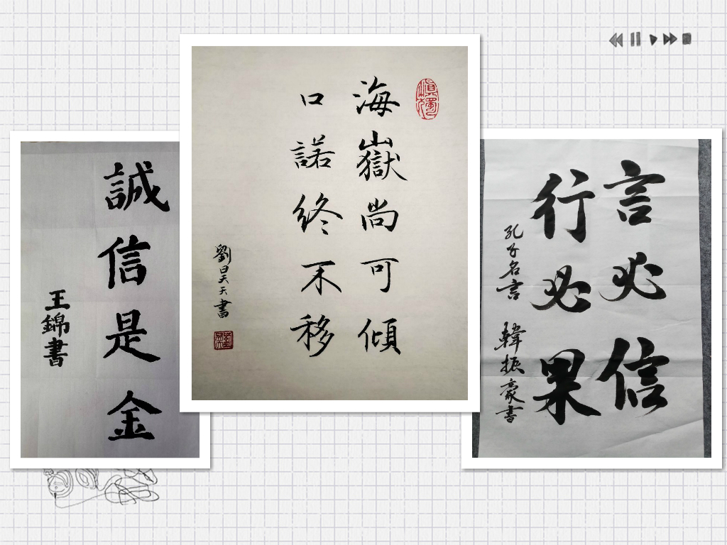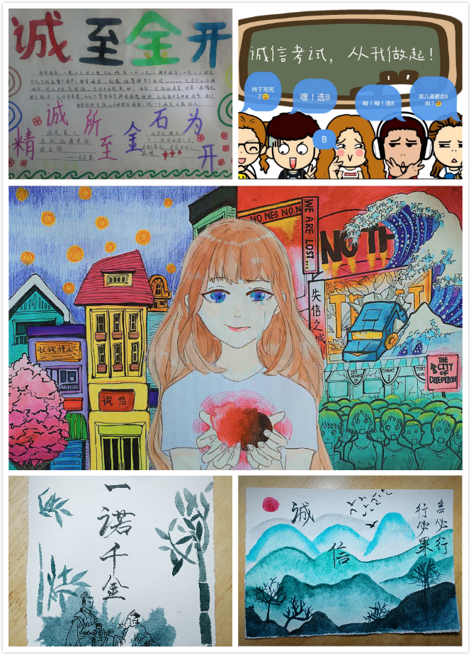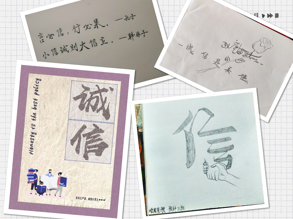 3、主题作品深入活动过程。为调动员工积极性,丰富青年员工群体的想象力、创造力,引导员工传播守信正能量。公司同步开展书法、绘画、海报、篆刻、剪纸、漫画等诚信主题作品创作活动,活动一经发布,得到了全院预科员工的积极响应,参与气氛浓厚,佳作频出,引人共鸣,活动中我们共收到了20名员工的创新作品。