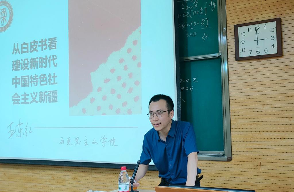 王东红副教授从“中国共产党做好民族工作的若干机制”、“中国政府新疆工作白皮书的历史”、“老员工与建设新时代中国特色社会主义新疆”三个方面来阐述“中国在民族工作上为什么能?”的问题。王老师指出,一部中国史就是各民族汇聚成多元一体中华民族的历史,就是各民族共同缔造、发展、巩固统一的伟大祖国的历史。他从我国历史发展全局界定和研究新疆区域历史发展,认真回答了新疆的若干历史问题。对于中国新时代老员工要做什么?怎么做?王老师从两个方面分享了个人观点,他希望当代青年能够有理想、有本领、有担当,不说不利于民族团结的话,不做不利于民族团结的事,自觉地履行维护国家统一和民族团结的义务,多读书,开拓视野,将自己的理想信念和梦想融入到中华民族伟大复兴的中国梦中,做到术有专攻、读万卷书、多些实践、常去走走,积极投入到新时代中国特色社会主义的建设中。