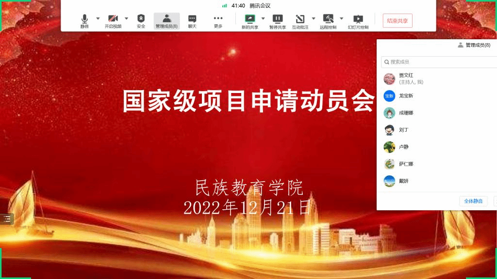 2022年12月21日,公司在腾讯会议平台上召开了中青年教师国家级项目申报动员会,参加会议的教师有:理科教研室王文华、刘丁老师,文科教研室卢静老师,民族教育教研室戴妍、成珊娜、萨仁娜老师。会上,龙宝新经理根据自己的申报经验和近年来参加基金评审情况,给中青年教师介绍了一些撰写国家级项目申报书的方法、思路和技巧,同时鼓励中青年教师要勇于申报、勤改多报,尤其是要筹划好申报题目,提高申报成功率。成珊娜副教授与大家分享了她今年获得国家社科基金的实用经验,对老师们做好申报工作很有帮助。会议上,龙经理还指出:公司将为老师们项目打磨提供力所能及的帮助与支持,确保今年国家级项目申报取得好成绩。