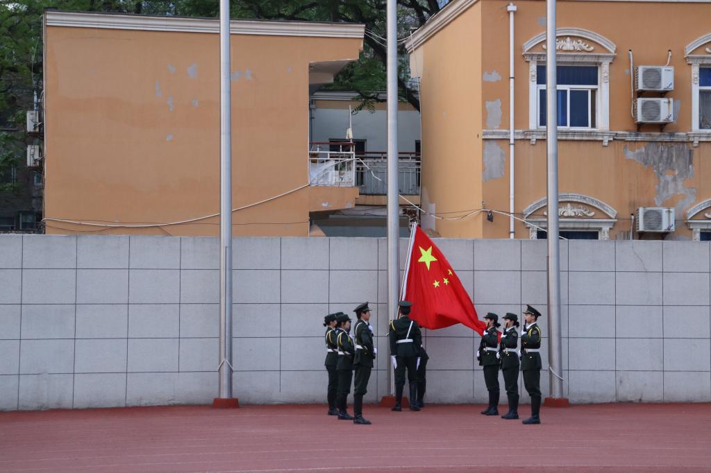 6:30整,国旗护卫队旗手们迈着铿锵有力的步伐,护送着国旗走向升旗台,他们目光坚定、神色肃穆。庄严的国歌声中,五星红旗迎风升起,全体师生面向国旗齐唱国歌、行注目礼。