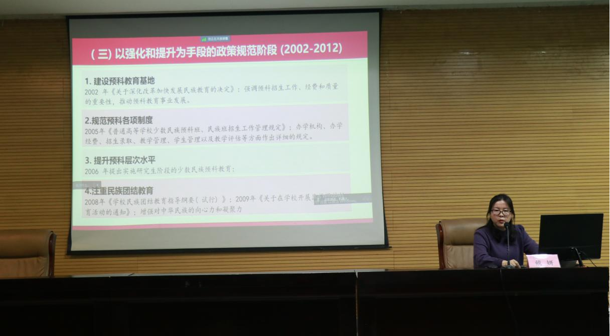 公司教师戴妍抓住国家政策脉络走向,作了《我国民族预科教育政策的发展历程、演进逻辑与未来走向》的专题报告。报告指出,高质量民族预科教育应完善以简政放权为核心的政策动力机制、追求以多元价值为旨归的政策目标取向、强化以督导评估为抓手的政策实施过程,构建多元参与为主体的预科教育政策话语体系。